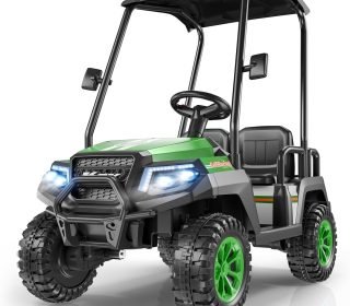 9.5-inch wide seats fit car seats comfortably. Multimedia includes USB/Bluetooth audio and volume control. Realistic golf cart styling complete with dashboard instruments.