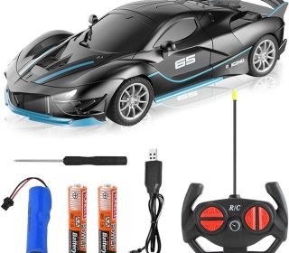 This black ABS plastic RC car measures 22x10x7 cm and delivers full-function control (forward, reverse, left/right turns, stop) at 5 mph with 98-foot 2.4GHz range for interference-free multi-car racing. Complete kit includes the car, rechargeable battery, USB cable, 2 AA remote batteries, and controller—ideal for kids 6+ seeking durable indoor racing fun on smooth surfaces like tile or hardwood.