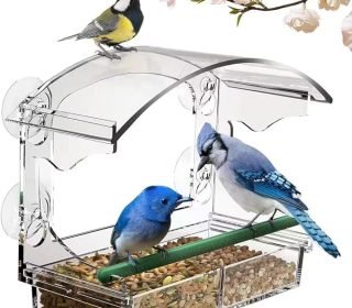 Apprise Deals window bird feeder transforms any glass surface into an up-close wildlife observation post using strong suction cups and transparent acrylic construction. This no-assembly design attracts finches, orioles, cardinals, and other wild birds to kitchen windows while featuring a curved roof for weather protection and dual compartment seed tray.